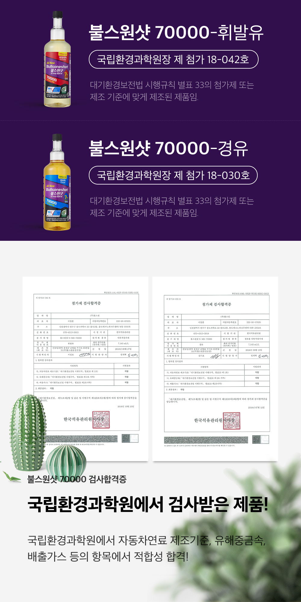 10. 검사합격증 번호(대기환경보전법에 따른 첨가제·촉매제에 한함) 대기환경보전법 시행규칙 별표 33의 첨가제 제조기준에 맞게 제조된 제품임. (불스원샷70000 경유차용: 국립환경과학원장 제 첨가 18-030호 / 불스원샷70000 휘발유차용: 국립환경과학원장 제 첨가 18-042호)
