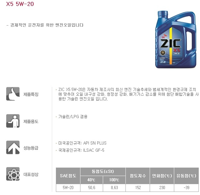 ZIC 지크 X5 5W20 4L SN플러스 PLUS +