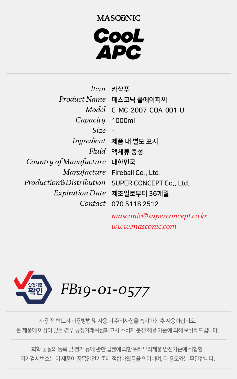 | 1. 품명 및 모델명 | 매스코닉 쿨에이피씨 1000ml |