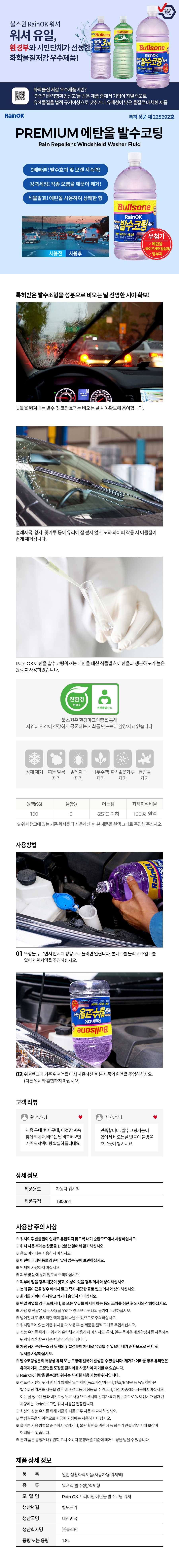 | 1. 품목 및 제품명 | 자동차용 워셔액/레인오케이 (RainOK) 프리미엄 에탄올 발수코팅 워셔 |